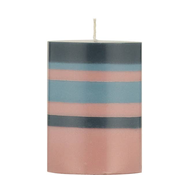 An eco, fair trade pillar candle, hand poured in bold stripes of British Colour Standard Rose Pink, Indigo and Pompadour. Individually boxed in an easily recycled box.