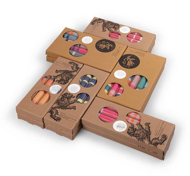Eco, fair trade dinner candles, here in narrower, striped bands of British Colour Standard Cool Colours in a charming mixed set. Mixed Pack of 6 24.5cm Tall 8-9 hour burn time, with a tall clean flame.