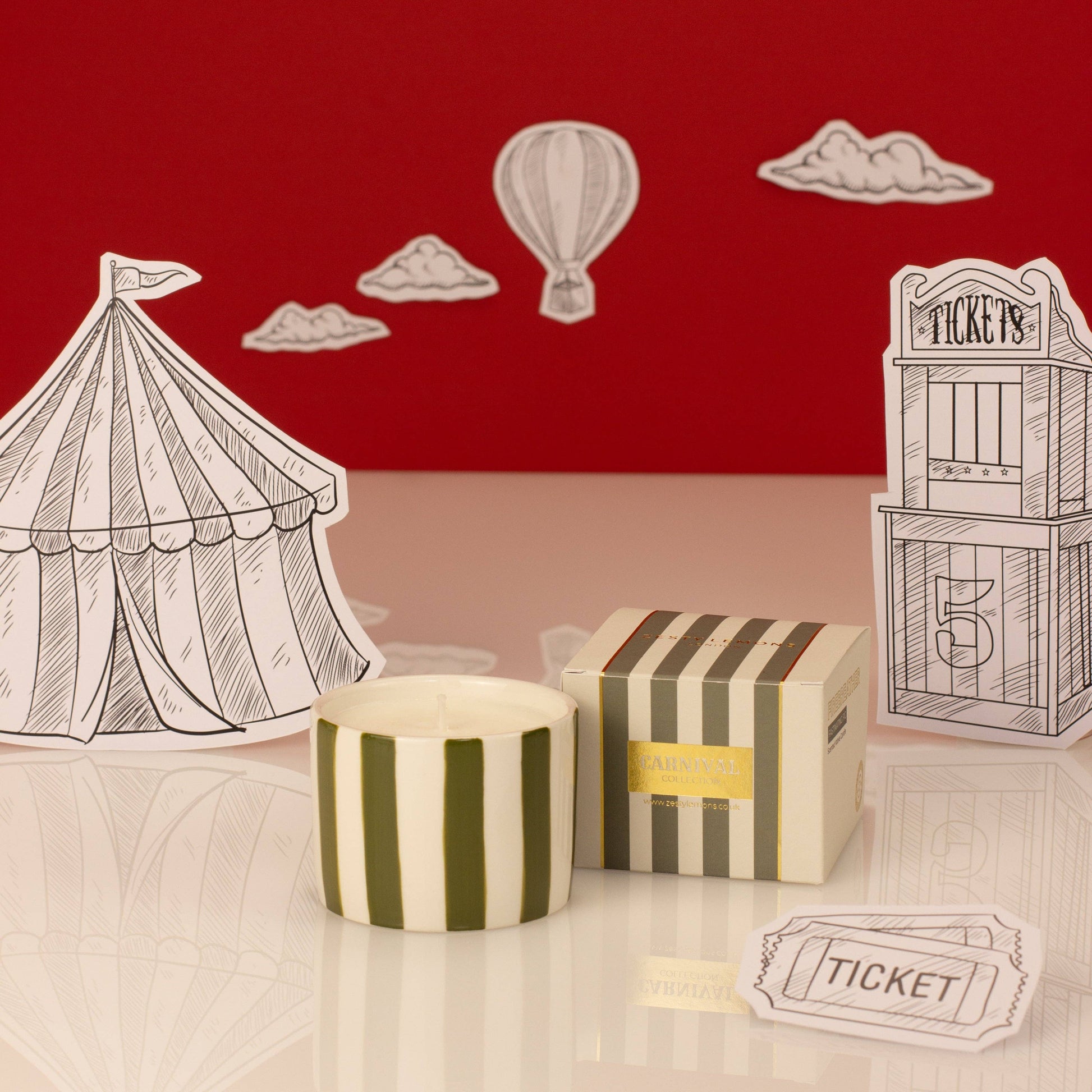 Housed in a striped ceramic vessel, this candle brings playful charm to your space with classic olive stripes that complement any space. Once the fresh scented blend of Tomato Leaf has burned down, the jar can be reused.
