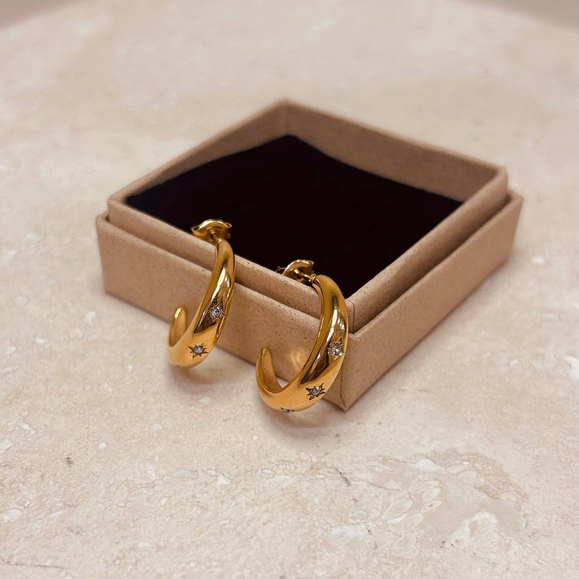 18k gold plated hoops in a classic hoop style with three embossed star stones. Comfortable enough to wear all day, in a timeless design that will take you from day through to night. Polished gold plated finish, that won’t fade or tarnish. Hypoallergenic, hard-wearing steel base for sensitive skin. Timeless design, made to be loved season after season. Water resistant, wear in the pool, shower or spritz with perfume and they will not discolour or tarnish.