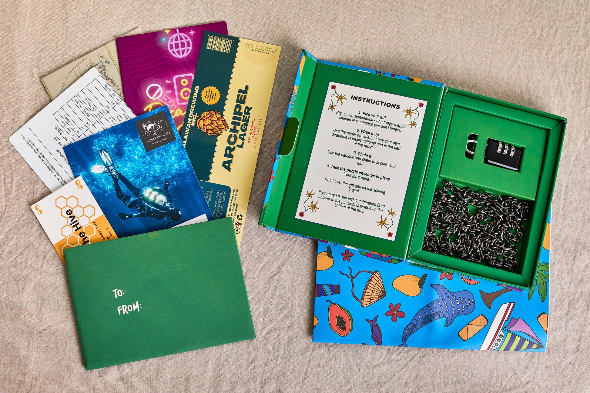 A member of the totally reimagined range of Padlock'd games. Elevate your gift for any puzzle fan! This puzzle game was imagined somewhere between a sunset swim and a karaoke marathon, all whilst enjoying a cold bottle of local lager. Each puzzle is steeped in Filipino flair - great for puzzle lovers with soft spots for sunsets and street snacks.