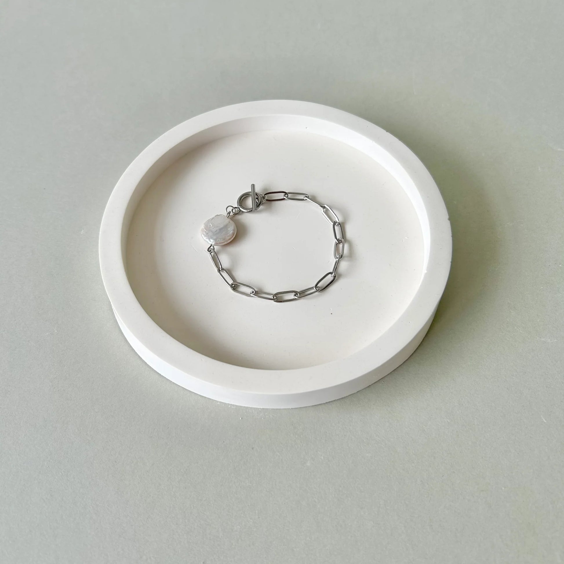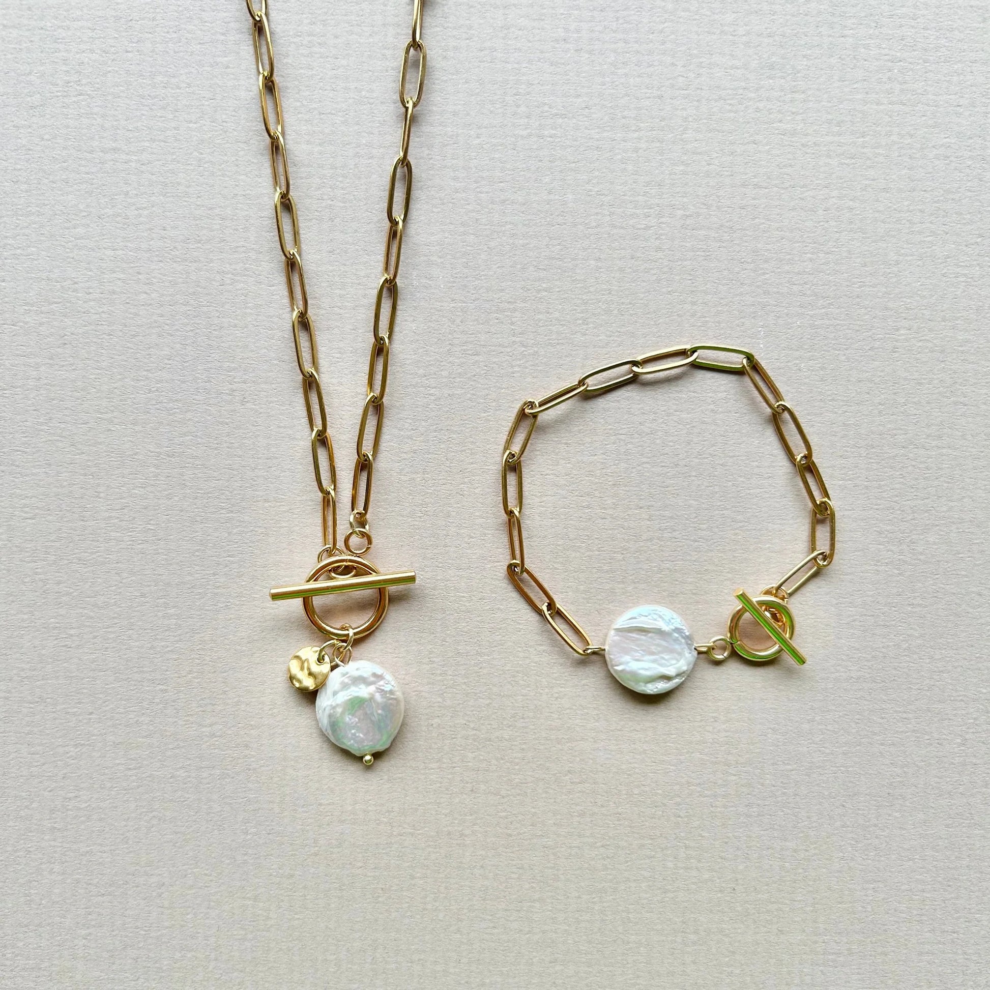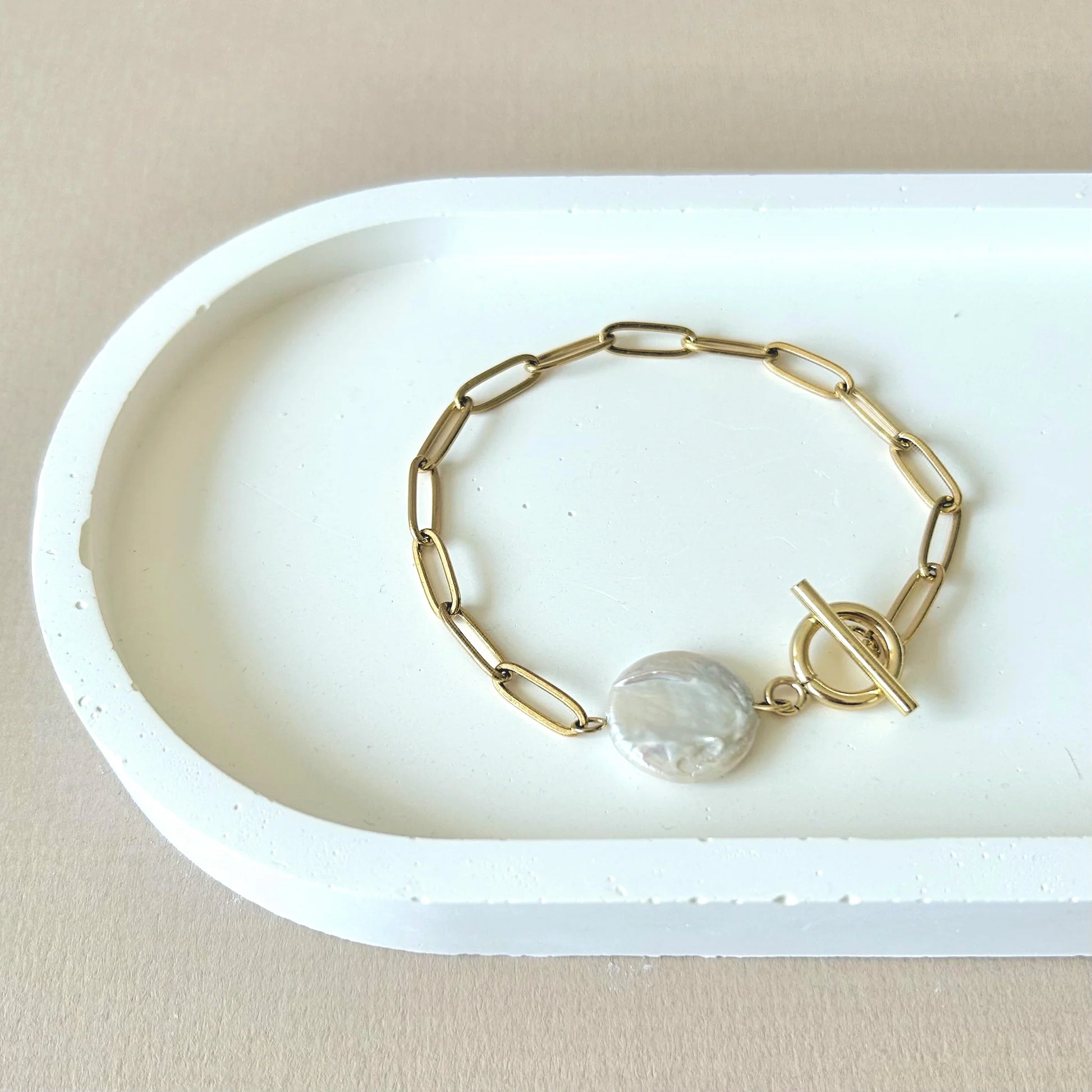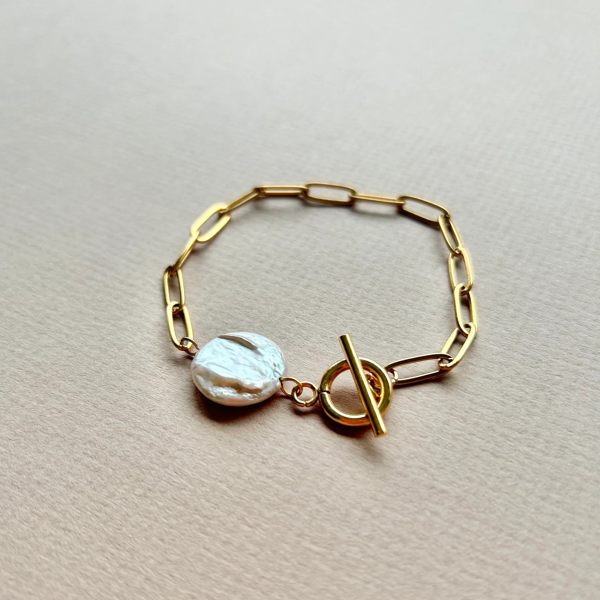 The Ocean bracelet has been created with elongated paper clip-shaped linked chain, adorned with a baroque pearl connecting bead & finished with a hoop & bar clasp.
