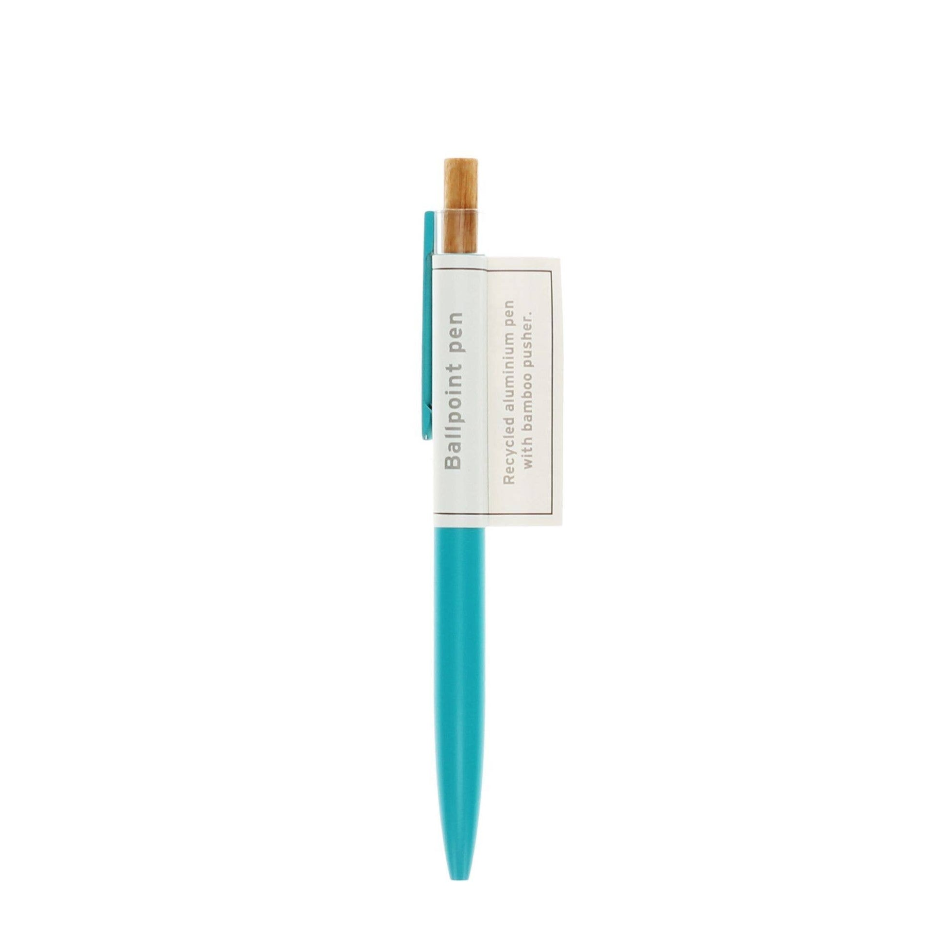 Smart and sustainably made retractable ballpoint pen in a stylish turquoise. Its barrel and clip are made from recycled aluminium with a matt lacquered finish, and its pusher is made from natural bamboo. Blue ink.